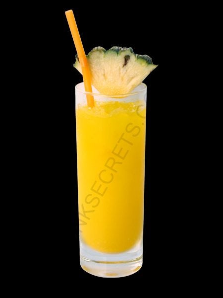 Giet de mix door een barzeef in een cocktailglas, dat gevuld is met wat ijsblokjes.